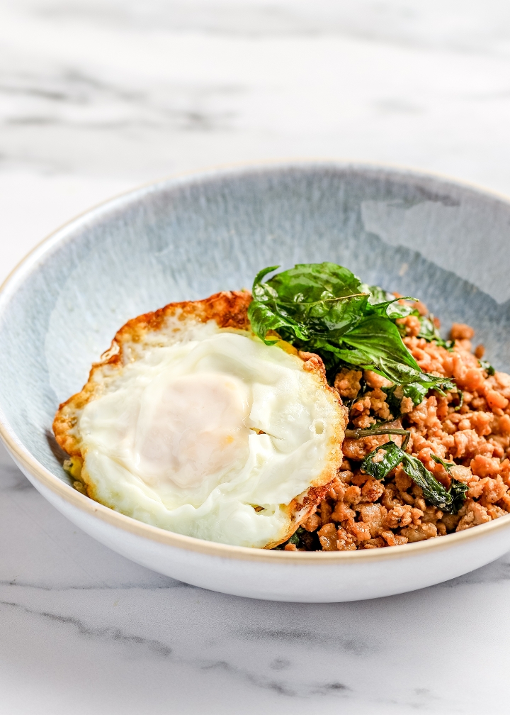Famous Thai dish. Stir fried basil, chili, garlic, onion, and bell pepper with basil sauce. Served with fried egg over jasmine rice.