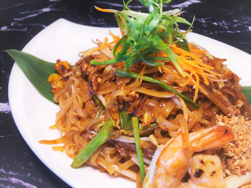 Stir-fried rice noodle, bean sprouts, scallion and crushed peanuts