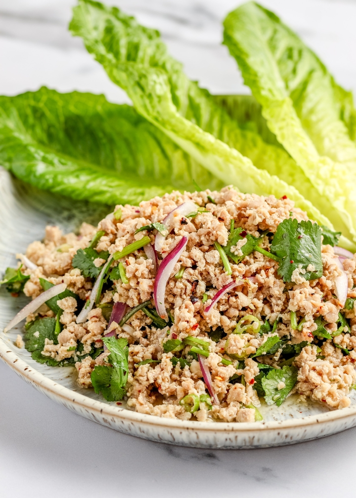 Your choice of chicken or pork seasoned with fish sauce, chili flakes, lime juice, toasted rice, fresh herbs, shallots and scallion