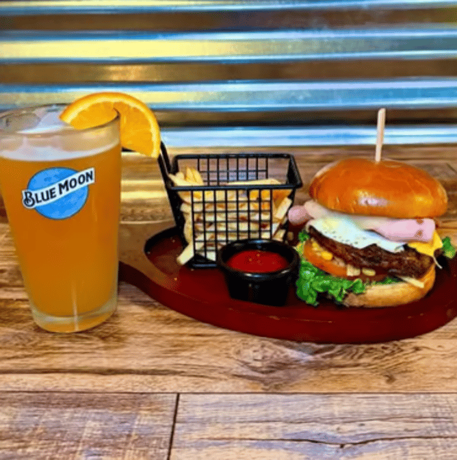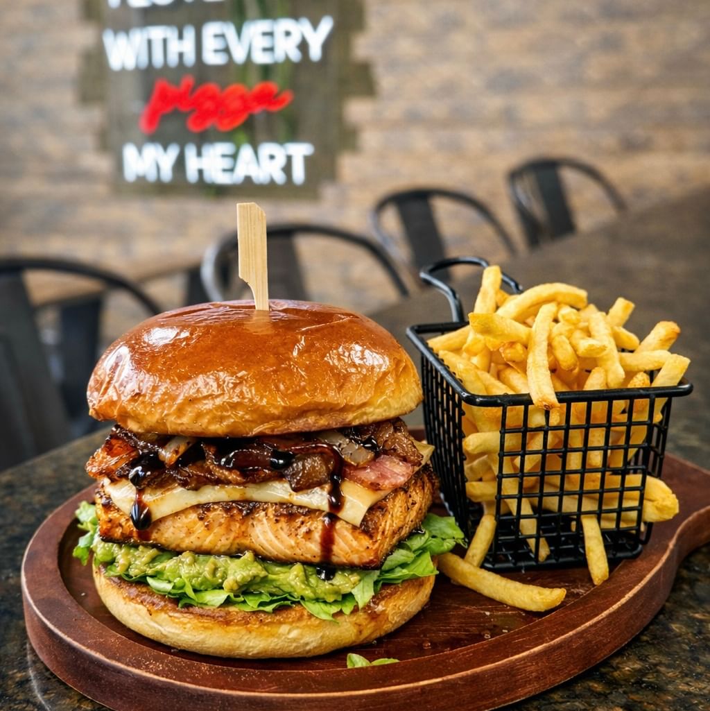 Grilled salmon, crispy bacon, melted cheese, guacamole, caramelized onions and balsamic glaze on a toasted brioche bun. Served with fries.