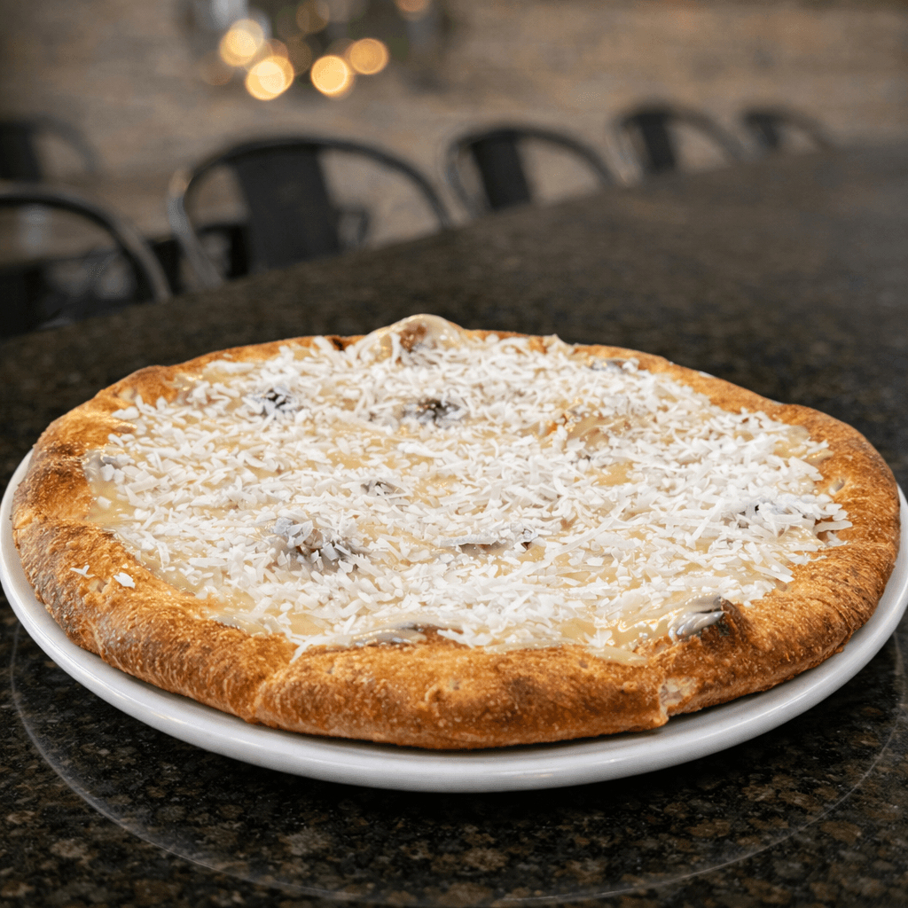 Pizza topped with a blend of four cheeses: fior di latte, gorgonzola, aged parmesan, and goat cheese