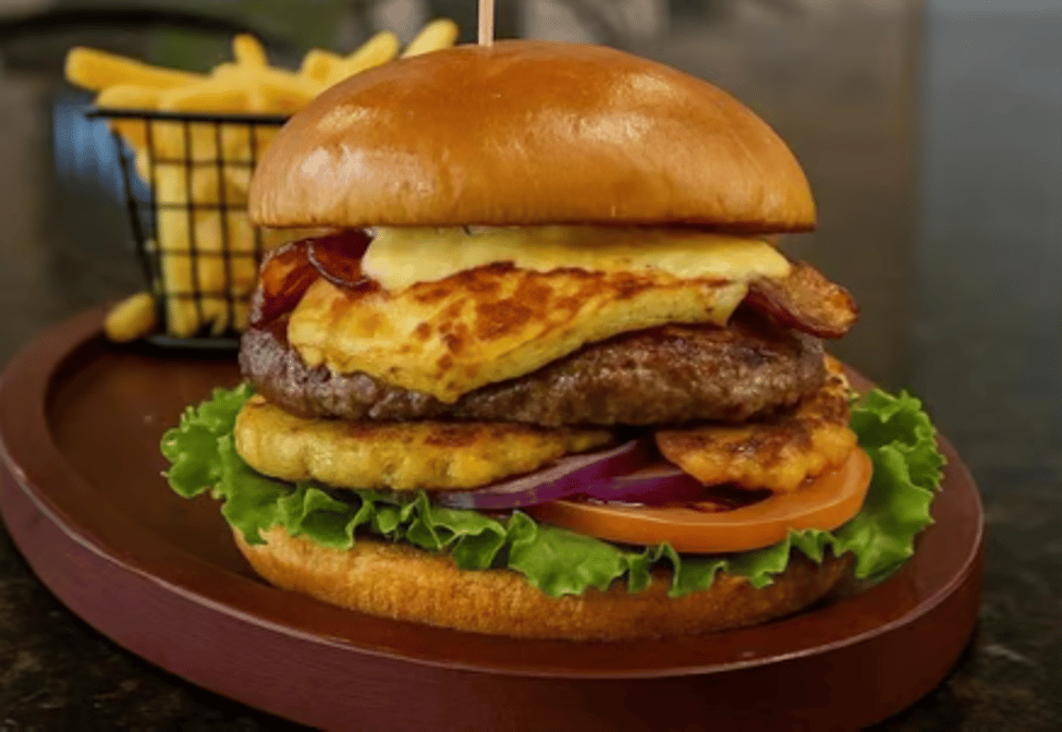 Fresh lettuce, tomato, garlic-seasoned tostones, onion, juicy beef patty, crispy bacon, and golden queso para freir