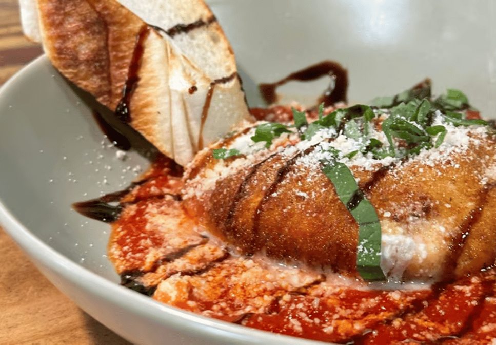 Vegetarian. Hand-breaded creamy-centered cheese, fried and served on a bed of marinara sauce topped with balsamic glaze