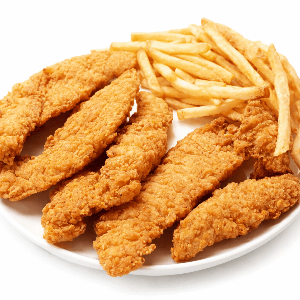 Crispy breaded chicken tenders fried to golden perfection, served with French fries.