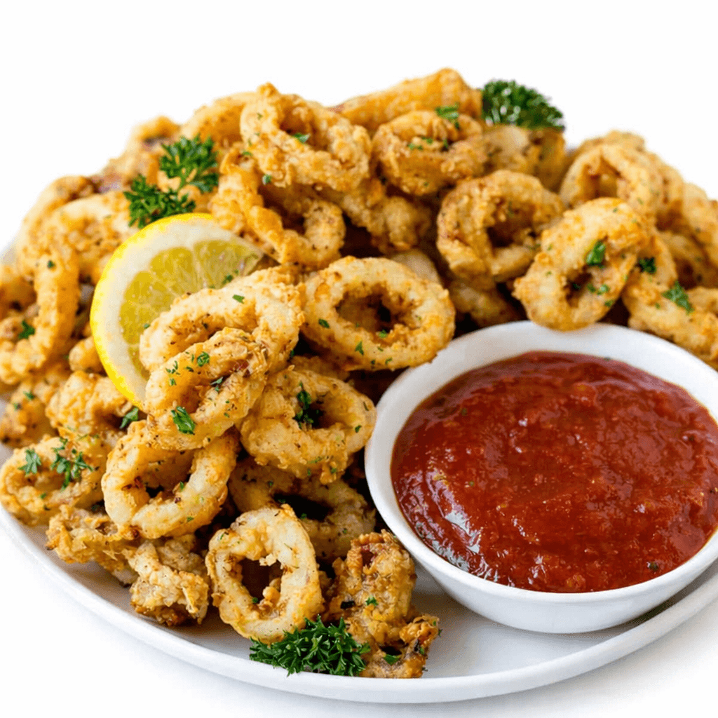 Hand-breaded calamari in marinara sauce and lemon .