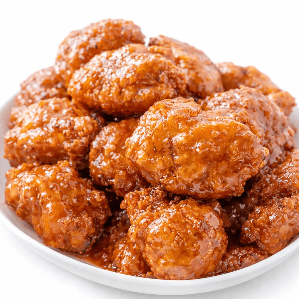 Boneless chicken wings, typically breaded and fried, served with a variety of sauces like buffalo, BBQ, garlic parmesan, or sweet chili
